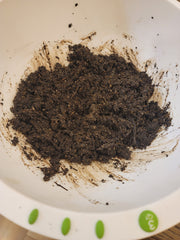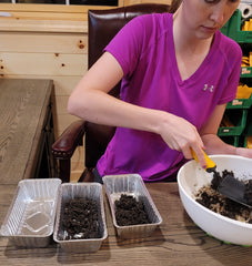 I add enough water to moisten 3 cups of garden soil (I buy bagged organic), and then I mix in vermiculite (a few teaspoons) and liquid kelp (see picture, below). You don't have to do the vermiculite or kelp, I just found it really helps but is not necessary. Our Indoor Garden Kit contains the perfect mixture.